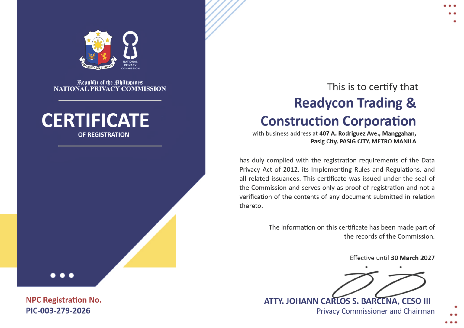 This is to certify that Readycon Trading & Construction Corporation, with business address at 407 A. Rodriguez Ave., Manggahan, Pasig City, has successfully completed the registration requirements prescribed under the Data Privacy Act of 2012, its Implementing Rules and Regulations, and related policies issued by the National Privacy Commission.